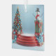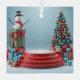 Un rendu 3D vibrant capture l'esprit de Noël avec une scène festive. Un sapin de Noël parfaitement décoré, orné de décorations rouges, bleues et dorées, se dresse à côté d'un podium rouge à plusieurs étages. De l'autre côté, un joyeux bonhomme de neige sort d'une boîte cadeau géante verte surmontée d'un arc rouge vif. Parsemés autour de la base sont enveloppés de cadeaux et de baubles colorés, complétant l'atmosphère joyeuse de vacances.