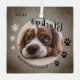 Nom du chien rustique de Noël du premier chiot et ornement en verre photo. L'arrière - plan est gris rustique avec des flocons blancs et des empreintes de pattes noirs. Personnalisez l'ornement avec la photo, le nom et l'année de naissance de votre chien - insérez votre photo de chiot préférée. Vous pouvez utiliser cet ornement personnalisé pour n'importe quel animal de compagnie. Une belle tenue de vacances pour un propriétaire de chien.
