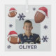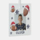 American Football Ball Santa Hat Name Photo Christmas Glass Ornament. Fun football ball with a red Santa hat, custom name and a photo. Featuring festive football design wearing Santa hat, these customizable ornament brings sporty cheer to your tree, wrapping, and gift list.