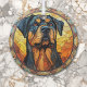 Voici un joli ornement en verre avec un thème de vitrail, avec un beau chien Rottweiler. Le chien est doré, orange et noir, et dressé contre un arrière - plan abstrait d'or avec une bordure multicolore. Cela fait un bon rembourrage ou la décoration pour le ménage qui aime une Rottie.