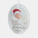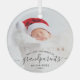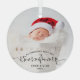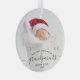 Help them celebrate their first grandchild with this beautiful modern keepsake ornament. The off-black text reads "Our first Christmas as grandparents," with the word "grandparents" in elegant handwriting script with flourishes before and after. Easily replace the sample image with your favorite photo of the new baby, and add his or her name and the year. A white gradient filter helps make the text pop.