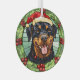 Voici un joli ornement en verre avec un thème de vitrail, avec un majestueux Rottweiler. Le chien porte un casquette du Père Noël rouge et blanc, avec un arrière - plan du ciel bleu. L'image est encadrée dans une jolie bordure de couronnes vertes et de cercles de baies rouges. Il s'agit d'une image haute résolution, de haute qualité, et fait un bon rembourrage ou décoration pour la maison qui aime une Rottie!