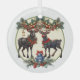 Ce décor rond de sapin de Noël est un bel ensemble de vacances. Il est parfaitement sphérique et a une finition brillante qui reflète les lumières scintillantes de Noël. L'ornement est orné d'une image de deux rennes de Noël, élégamment dépeint en mi-carrière. Ils sont minutieusement détaillés et présentent leurs majestueux bois et leurs éléments délicats. Autour des rennes, des branches décorées d'arbres de Noël apportent une touche de verdure à la décoration. Les branches sont agrémentées de minuscules billes étincelantes et d'un éclat de blanc qui imite l'aspect de chutes de neige fraîches. La combinaison des rennes et des branches décorées crée une scène festive qui résume l'esprit de la saison des fêtes. Cet ornement n'est pas seulement une décoration, mais une oeuvre d'art qui ajoute une touche de magie et d'émerveillement à n'importe quel arbre de Noël.