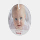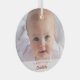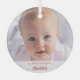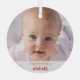 Un ornement très simple de Mon premier Noël, avec juste une photo de bébé et, dans la partie inférieure, sur une zone transparente, les mots "Mon premier Noël" dans un script manuscrit et en dessous, le nom en lettres plus grandes. Tout le texte est rouge