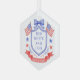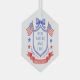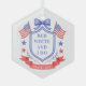 This patriotic ornament features a watercolor crest with a light red white and blue patriotic crest with American flags and a blue bow. Text in the center of the crest says "Red, white and I do." You can personalize with your event date.