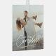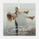 Make your first Christmas as Mr. & Mrs. truly unforgettable with our custom photo glass ornament. Featuring a charming white script of your shared surname, along with a beloved photo from your special day, this design template is the perfect way to commemorate your newlywed joy. Personalize it with the year to add a touch of sentimental nostalgia. Cheers to love, laughter, and a happily ever after holiday season.
