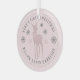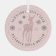 Ornement moderne bébé rose poussiéreux pour le premier Noël de bébé personnaliser avec le nom de bébé, année, cerf avec un nœud, flocons de neige et lettrage courbe en police serif.