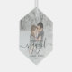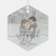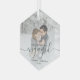 Commémorez votre fiançailles avec ce magnifique ornement de gardien moderne. Le texte vert foncé dit "Notre premier Noël engagé", avec le mot "engagé" dans un élégant script d'écriture manuscrite avec des fioritures avant et après. Remplacez l'exemple d'image par votre photo préférée, et ajoutez vos noms et l'année. Un filtre dégradé blanc permet de faire apparaître le texte.