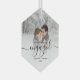 Commémorez votre fiançailles avec ce magnifique ornement de gardien moderne. Le texte noir indique "Notre premier Noël engagé", avec le mot "engagé" dans un élégant script d'écriture manuscrite avec des fioritures avant et après. Remplacez l'exemple d'image par votre photo préférée, et ajoutez vos noms et l'année. Un filtre dégradé blanc permet de faire apparaître le texte.