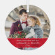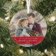 Pour votre premier Noël marié, cet élégant ornement photo de vacances romantique présente votre photo avec une bande rouge pour le script de typographie blanche qui dit "notre premier Noël marié" avec vos noms et la date à personnaliser. Conçu par ©Susan Coffey.