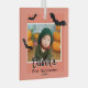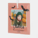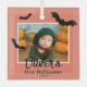 Premier ornement en verre photo pour chauves-souris noires d'Halloween. Un nom de bébé personnalisé dans un script branché et 3 chauves-souris noires. Personnalisez l'ornement avec la photo, le nom et l'année de votre bébé. Une belle tenue de vacances Halloween.
