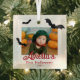 Premier ornement en verre photo pour chauves-souris noires d'Halloween. Un nom de bébé personnalisé dans un script branché et 3 chauves-souris noires. Personnalisez l'ornement avec la photo, le nom et l'année de votre bébé. Une belle tenue de vacances Halloween.