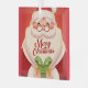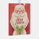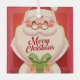 Illustration du Père Noël tenant un cadeau avec un arc vert, dressé contre un arrière - plan rouge, avec les mots "Joyeux Noël" écrit en rouge cursif sur sa barbe. L'illustration est conçue pour ressembler à un ornement de Noël carré, avec une corde blanche en haut pour être suspendue. Le style rappelle celui des cartes de fin de année vintages, avec des lignes épurées et une palette de couleurs limitée.