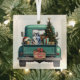 Un pick-up bleu turquoise porte un arbre de Noël décoré et des colis cadeaux sur ce joli ornement de Noël en verre. Vue de la hayon arrière est un beau chien sibérien Husky. Un panneau en bois rustique sur le pare-chocs arrière dit "Cheer de Noël".