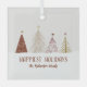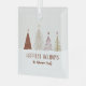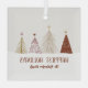 Une conception d'ornement d'accent de vacances élégant et festif présente un étalage classe d'arbres de Noël enneigés en rouge, or et rose sur un fond beige crème neutre légèrement rayé. La section inférieure est recouverte de neige blanche avec "Vœux de fêtes de fin d'année" dans une typographie classique élégante. Ajoutez un nom ou une ligne de texte personnalisé dans un script rouge assorti avec le modèle simple à utiliser.