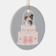 Ornement personnalisé qui vient avec une illustration d'un gâteau de mariage avec le ruban et les coeurs. Les hauts de forme de gâteau incluent une jeune mariée dans la robe et le marié blancs dans le casquette supérieur noir et le costume sous une arcade florale de cloches de mariage. Personnalisez avec les noms des couples de mariage et de la date de mariage !