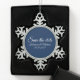 Enregistrez la date, script personnalisé texte Mariage Faire-part Flocon de neige Ornement de Noël de l'ewter Pewter. Élégant ornement bleu marine et blanc.