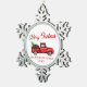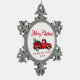 Un magnifique style flocon de Noël de Noël ornement avec Joyeux Noël en script de calligraphie, votre nom de famille personnalisé et l'année. Dispose d'une aquarelle vintage camion rouge avec des lampes à cordes et chargé d'un arbre de Noël et cadeaux pour tous.