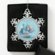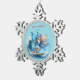 A silver, intricately designed snowflake ornament holds a circular insert featuring a vibrant illustration. The image depicts a blonde fairy with iridescent blue wings, dressed in a blue outfit, gracefully surfing on a large, foamy blue wave. Her long hair flows behind her as she balances on a light brown surfboard. The background is a soft blue, and the text "Merry Christmas" in red and the name "Vivian" in green are printed above the fairy. This unique ornament blends a magical, whimsical theme with a touch of surf culture, perfect for someone named Vivian who loves fairies, the ocean, or surfing during the holidays.