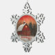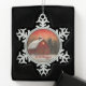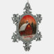 This stunning snowflake shaped Christmas ornament features a red barn with a golden star on it at night, with stars twinkling in a reddish sky. Green trees, with snow on their boughs, frame the sky, and snow is covering the ground. Your or your recipient's name appears in deep red.