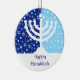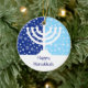 L'ornement parfait pour la famille interconfessionnelle. Une menorah Hanoukka est silhouette contre un champ d'étoiles et de flocons de neige bleu foncé et clair. Votre message personnalisé va ci-dessous. On peut aussi l'utiliser comme ventilateur, poules lumineuses ou aveugles ou décoration murale. Disponible avec des produits correspondants.
