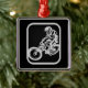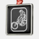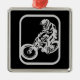 Une descente en VTT et cavalier. La moto est dessinée en gris, utilisant la technique "espace blanc" sur un arrière - plan noir. Le coureur descend sur la colline et se voit donner une perspective par la roue avant de la moto en regardant plus grand (plus près) que l'arrière.