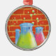Équipement en verre de dessin animé sur un banc, collection d'objets scientifiques expérimentaux en verre assis sur un banc en bois devant un mur en brique.
