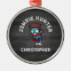 Un ornement macabre avec un zombie à l'allure cool, portant des vêtements déchirés et en lambeaux avec les bras tendus à la recherche de brèches. De grands yeux vides avec une peau pourrie et écossaise. Le sang éclate derrière sa tête. Le texte dit zombie chasseur, en lettres incurvées. Personnalisez avec un nom. Placez-vous sur un arrière - plan gris charbon.
