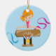 Personnalisez et ornement daté de Noël, fille rouge mignonne de gymnaste de cheveux faisant une fente sur une chambre forte réglée sur un arrière - plan bleu de pois avec un ruban #1. Un cadeau de Noël de merveille sure à priser depuis de nombreuses années pour venir.