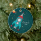 Ce garçon mignon personnalisé autour de l'ornement en céramique a hors de ce thème de l'espace du monde ! L'arrière - plan a une couleur turquoise foncée avec un bon nombre d'étoiles jaunes, blanches, et de gris à l'arrière-plan. Il y a un vaisseau spatial sur le fond avec une planète orange et rouge avec des anneaux autour de elle au dessus. Du côté droit, vous pouvez facilement customiser le nom et l'année.