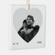 Un ornement moderne en céramique carré blanche avec une grande fenêtre photo en forme de coeur. Nettoyer, machine à écrire micro texte équilibre le design (initiales à gauche, année à droite) tandis que le look monochrome flatte n'importe quelle photo de couple. Modifiez les initiales et l'année pour marquer des fiançailles, des anniversaires ou un cliché de vacances préféré - un élégant souvenir pour l'arbre ou la boîte cadeau.