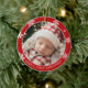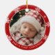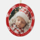 Commémorez un jalon précieux avec cet ornement doux et festif pour le premier Noël de bébé. Conçu dans un style de vacances classique, cet ornement photo rond présente un fond rouge audacieux orné de délicats flocons de neige blancs, encadrant la photo de votre petit dans un cadre chaleureux et mémorable.