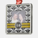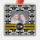 Ornement photo mariage damassé noir et blanc avec votre photo précieuse encadrée en noir et blanc damassé motif noir et jaune bandes et vos initiales en cercle.