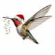 "hummingbird wearing red santa hat", "holding lighting christmas decoration", "colorful string lights tree ornament", "flying humming bird in flight", "ruby throated throat", "christmassy funny humorous humor", "cute wildlife birds fly", "hummer birding nature animals", "merry xmas bird lovers fans", "beak hanging carrying animal"