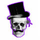 Le marié gothique drôle de crâne portant un casquette supérieur traditionnel et un ornement acrylique d'araignée effrayante avec une bordure pourpre, pourrait être employé comme ornement pour les parties alternatives de mariages de noir foncé ou de célébration de Halloween ou être customisé dans d'autres styles de produit, comme goupille ou comme sculpture pour une décoration de gâteau. Conception d'Oconnart.