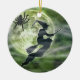 Un design graphique de vacances d'Halloween de pleine lune et une silhouette d'une sorcière volant devant elle. Une araignée descend et il y a des toiles dans les coins.