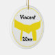 Personnalisez l'unique ornement Jaune de ceinture des arts martiaux avec le nom de votre artiste martiaux et l'année pour commémorer un test de promotion, un anniversaire ou un jour férié. Celui-ci, d'un genre ornement d'arts martiaux, présente une numériquement photo améliorée d'une ceinture d'arts martiaux attachée dans un noeud.