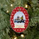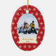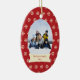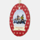 Cet ornement en céramique de vacances ovales de Noël a un arrière - plan coloré par rouge avec un bon nombre de flocons de neige crèmes tout autour à l'arrière-plan. Au milieu, vous pouvez customiser la photographie de famille avec vos propres. Au-dessous de la photo, il y a une bannière blanche et blanche où vous pouvez personnaliser le nom de famille et l'année. Vous pourriez customiser le texte pour le premier Noël d'un bébé ou même notre premier Noël pour un ménage marié nouvellement !