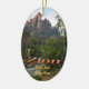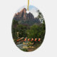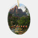 Un ornement en céramique ovale montrant une magnifique image paysagère de la rivière Vierge qui traverse le parc national de Sion. Des chênes verts à baldaquin, ainsi que d'autres arbres plus petits, ponctuent les prairies brunes qui bordent ce cours d'eau rapide et dominent le premier plan. Des collines ondoyantes avec une ligne de faille de falaises ocre rouge se trouvent au-delà. Au loin, The Watchman se jette dans un ciel de nuages gris clignotant dans un ciel bleu poudreux. Le texte peut être modifié ou supprimé à l'aide du modèle Personnalisez-le et la bannière Sion peut être supprimée en cliquant sur le lien Effacer sous lequel Personnalisez le modèle. Vous pouvez modifier les polices de texte, la taille, la couleur, la position et l'alignement en cliquant sur le bouton Customiser.