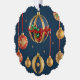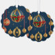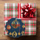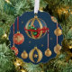 Les boules et ornements de Noël dorés et rouges sont élégamment suspendus avec des rubans, créant un décor de vacances festif et raffiné sur un fond bleu foncé avec des flocons de neige subtils.