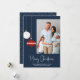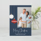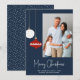 Cette carte photo moderne rétro de Noël est facile à personnaliser en utilisant les outils de modèle en ligne. Le design présente des ornements de Noël blanc et rouge blanc blanc et blanc du milieu du siècle sur un arrière - plan bleu marine. L'ÉCHANTILLON DE PHOTO FAMILIALE N'EST PAS INCLUS. REMPLACEZ PAR VOTRE PROPRE PHOTO AVANT DE COMMANDER.