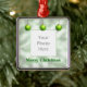 3 ornements de Noël verts sur un arrière - plan chatoyant. Le texte personnalisable dit "Joyeux Noël".