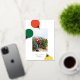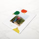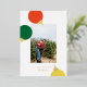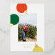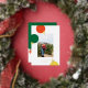Un design moderne de carte de vacances comportant 3 ornements de style rétro en rouge, vert et jaune entourant une photo personnalisée au-dessus d'un message saisonnier personnalisé et d'une signature.