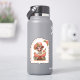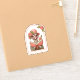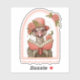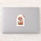 Amusing, beige, bird illustration of an ostrich wearing a hat with flowers and holding a book, enclosed in an arched frame with text "Books help me keep my head out of the sand". Personalise the text or leave as is. Beautiful custom-cut vinyl sticker for book lovers. This image is based on a composition of generative content of which I have added new colours, arched frame and text.