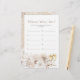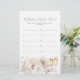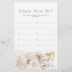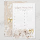 (Choisissez la finition de papier MATT - PAS semi-brillant - pour écrire dessus.) Ajoutez une activité amusante et mémorable à votre baby shower avec le jeu 'Où étions-nous ?', où les invités devinent les lieux des photos mettant en vedette la mariée et le marié. Ce jeu, orné de délicates fleurs aquarelles et de perles élégantes, apporte rire et joie à votre célébration, complétant parfaitement la collection de baby shower Elégantes Perles et Prosecco.