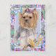 Encouragez un ami ou un amoureux des chiens qui a mis au sort un animal de compagnie Yorkshire Terrier lorsque vous envoyez une carte postale, une carte de voeux ou une carte de billet avec une carte "Oubliez-moi pas" de Friskybizpet Designs. Yorkie bien-aimée est encadrée de fleurs symboliques Forget-Me-Not.
