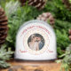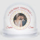 Celebrate your first Christmas together with this elegant Bible verse photo snow globe. The front features your custom photo framed in a gold botanical wreath with classic red accents, along with personalized names.