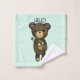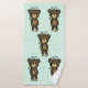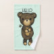 Serviette de bain sertie d'une simple illustration d'un ours en caricature marron tenant une marguerite jaune. Bonjour écrit au-dessus de sa tête. Placé sur un arrière - plan vert pâle.