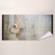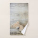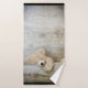 Serviette sertie d'une photo de chéri d'un mignon ours en peluche, debout près d'un mur en bois rustique / fond.