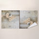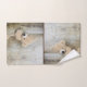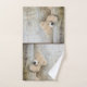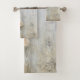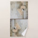 Serviette sertie d'une photo de chéri d'un mignon ours en peluche, debout près d'un mur en bois rustique / fond.
